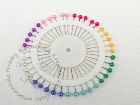 Vas gombostű gyöngyházfényű, színes fejjel, 8 különböző színből (fehér, sárga, piros, kék, zöld, rózsaszín, lila, türkiz) 5-5 db. (összesen 40 db egy levélen).