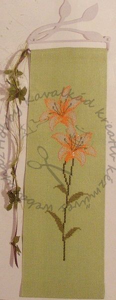 A készlet tartalma: zöld színű len anyag, szükséges színű és mennyiségű, 100% pamut, hímzőfonal, leszámolható mintaív, tű, fém akasztó. Méret: 10 x 32 cm.