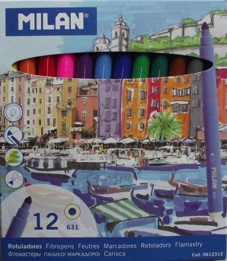12 különböző színű, 5 mm írásvastagságú, 16,5 cm hosszú, 1 cm átmérőjű filctoll. A színek egymással keverhetők.