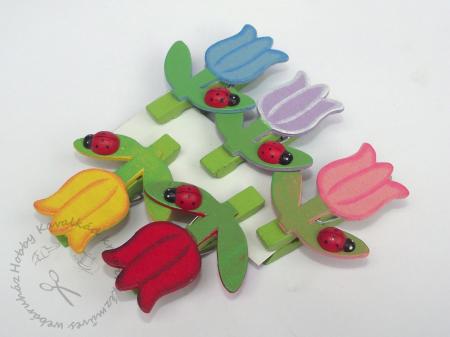 4,5 cm-es csipeszen, kb. 4 x 4 cm-es tulipán, levelén katicával. 5 különböző szín (sárga, piros, kék, lila, rózsaszín)
