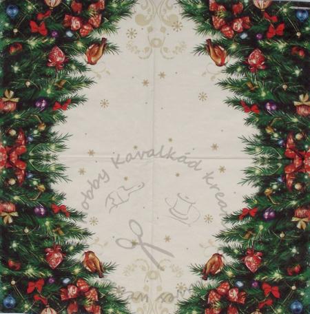 Szalvéta szarvas fenyőkoszorúval, ezüst-fehér pöttyös