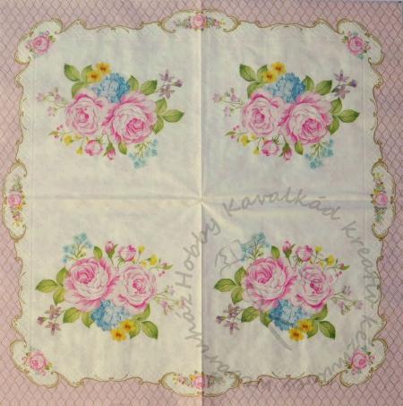 Szalvéta Rózsa hortenziával rózsaszín, arany cirádás szegéllyel