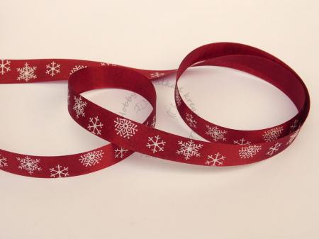 Szatén szalag mintás 15 mm - Bordó alapon fehér hópelyhek