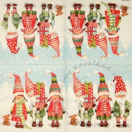 Szalvéta Három manósapkás kisgyermek ajándékokkal