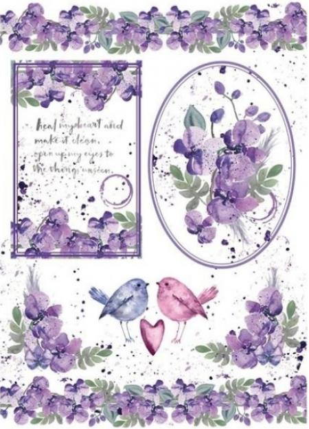 Rizspapír 21 x 29 cm - Festett lila virágok madárkákkal