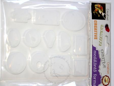 15 x 11,3 cm-es lapon 12 féle öntőforma az akasztó számára kialakított lyukkal. A formák: négyzet (2 méretben), téglalap (2 méretben), kör (2 méretben), Ovális (2 méretben), lyukas kör, csepp, kirakó, félkör