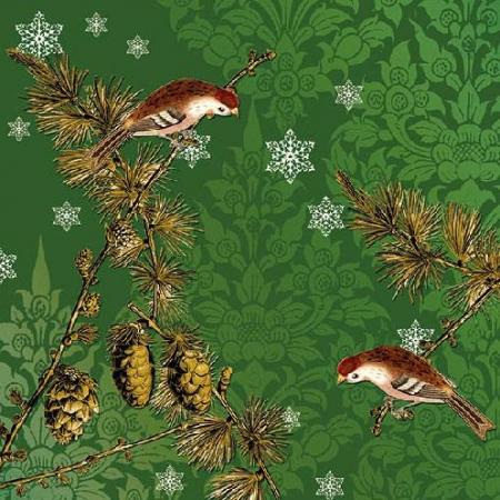 Szalvéta 10791 Madárkák fenyőágon zöld mintás háttérrel