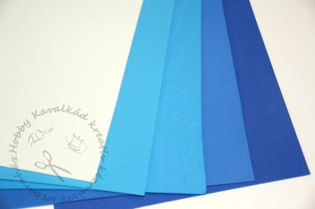 A csomag tartalma 5 db különböző színű (4 különböző kék árnyalat, 1 db fehér), A4-es méretű, 2 mm vastag dekorgumi