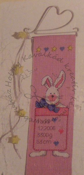 A készlet tartalma: mályva színű len anyag, szükséges színű és mennyiségű, 100% pamut, hímzőfonal, leszámolható mintaív, tű, fém akasztó. Méret: 10 x 32 cm.