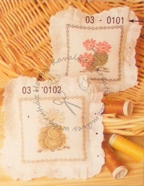 A készlet tartalma: fehér színű hímzővászon, szükséges színű és mennyiségű, 100% pamut, hímzőfonal, leszámolható mintaív, tű, csipke a szélére. Méret: 12 x 12 cm.