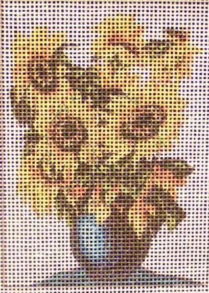 7 x 10 cm. Szimplaszálas, fehér tűgobelinre festett gobelin fonal nélkül. 72 öltés / 10 cm.