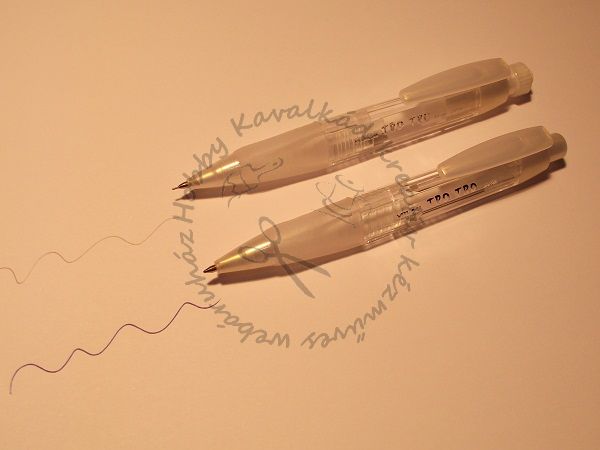 Fehér, vastag, háromszögletű test, gumifogós. A töltőceruza 0.5-ös ironbéllel tölthető. A toll írásszíne kék.