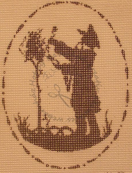 10 x 13 cm. Szimplaszálas, fehér tűgobelinre festett gobelin fonal nélkül. 72 öltés / 10 cm.