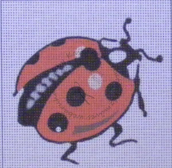 15 x 15 cm. Duplaszálas, fehér kanavára festett gobelin fonal nélkül. 44 öltés / 10 cm.