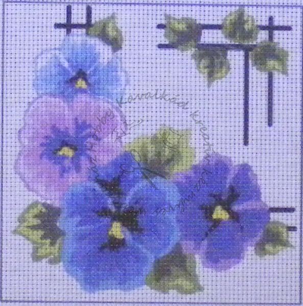 15 x 15 cm. Duplaszálas, fehér kanavára festett gobelin fonal nélkül. 44 öltés / 10 cm.