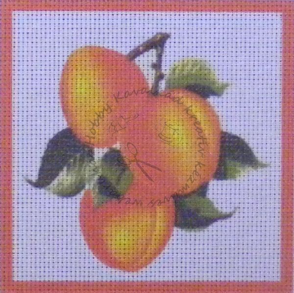 15 x 15 cm. Duplaszálas, fehér kanavára festett gobelin fonal nélkül. 44 öltés / 10 cm.