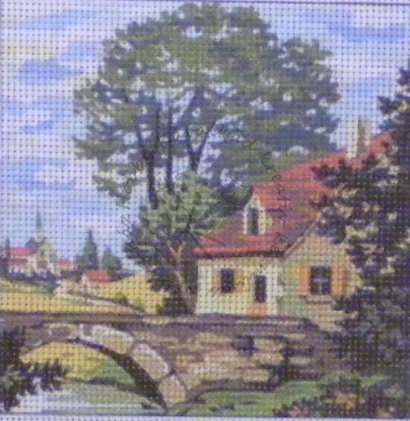 15 x 15 cm. Duplaszálas, fehér kanavára festett gobelin fonal nélkül. 44 öltés / 10 cm.