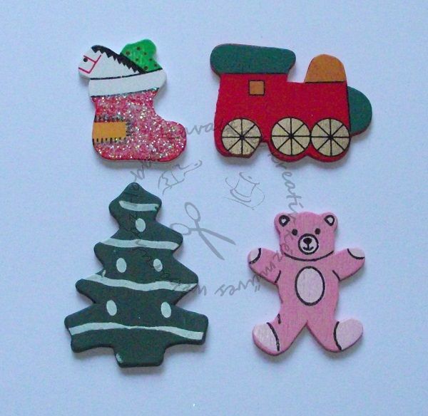 A csomag tartalma 4 db különböző (vonat, fenyőfa, csizma, mackó) karácsonyi mintás famatrica. Méretük egyenként kb. 3 x 3,5 cm.