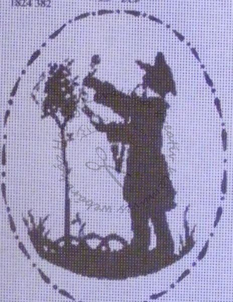 18 x 24 cm. Duplaszálas, fehér kanavára festett gobelin fonal nélkül. 44 öltés / 10 cm.