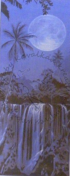 20 x 50 cm. Szimplaszálas, fehér tűgobelinre festett gobelin fonal nélkül. 72 öltés / 10 cm.
