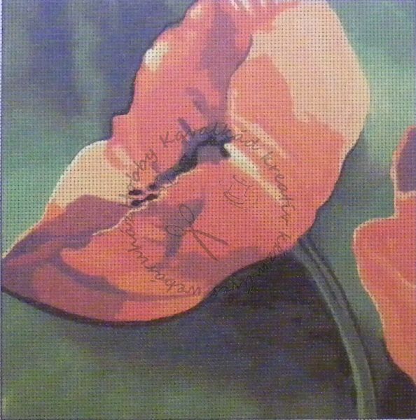 25 x 25 cm. Duplaszálas, fehér kanavára festett gobelin fonal nélkül. 44 öltés / 10 cm.