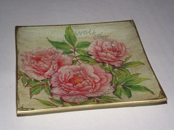 Tipp: az alsó képen látható tárgy elkészítésének menete: Mivel olyan tárgyról van szó, aminek a díszítését a "fonákján" végezzük, fordított sorrendben kell haladnunk. 1. Az üveg felületét alaposan megtisztítjuk (én ablaktisztítót szoktam használni). Majd a két fázisú repesztőlakk első fázisát egyenletesen felkenjük. Hagyjuk megszáradni, vagy a folyamatot hajszárítóval meggyorsíthatjuk.Teljes száradást akkor látunk, ha az üveg visszanyerte átlátszó tulajdonságát. 2. Szintén egyenletesen felkenjük a második réteget, azaz a kétfázisú repesztőlakk második fázisát. Fontos, hogy a második réteget az ujjunkkal dörzsölgessük jó alaposan míg egy kicsit zselés lesz a felületen a lakk. Hagyjuk száradni, vagy idő hiányában használjunk hajszárítót. 3.Miután megszáradt a felület, a fény felé fordítva már láthatóak a repedések, de még mindig átlátszó a felület. Hogy a repedéseket kiemeljük oldószeres (fontos, hogy oldószeres legyen) patinát tegyünk a felületre, kissé hagyjuk szikkadni, majd egy gombóccá gyúrt feszes rongydarabbal a felesleget töröljük vissza. Ha kicsit barnás a felület, ne aggódjunk, ez csak emelni fogja az antik hatást. 4.Mivel ez a felület még vízoldékony, az egész felületet le kell kenni oldószeres lakkal. Hagyjuk teljesen megszáradni. 5. Ezután következhet a szalvétázás. Válasszunk egy szalvétát szükség esetén vágjuk körbe a mintát.Dekupázs ragasztólakkal (ez már vízoldékony) kenjük be a minta helyét, helyezzük rá a szalvéta legfelső mintás rétegét, símítsuk el óvatosan, majd kenjük le újra a ragasztólakkal. Hagyjuk száradni. 6. Az üveg felület még mindig áttetsző. Ahhoz, hogy szépen kiemeljük a repesztést, és a szalvéta mintáját, lezárásként az egész felületet kenjük át világos (példánkban elefántcsont) színű akril festékkel. Ugyanezzel a festékbe ujjunkat mártogatva kenyjük át a tálka szélét is. A képen én arany színű viaszpasztát használtam. Leírni bonyolult, de ha a pontos sorrendet batartjuk, és a megadott anyagokkal dologzunk, a siker nem marad el. Szükséges anyagok, eszközök tehát: Kétfázisú repesztő lakk oldószeres patina oldószeres lakk szalvéta dekupázs ragasztó oldószer (az ecset kimosásához) akril festék |