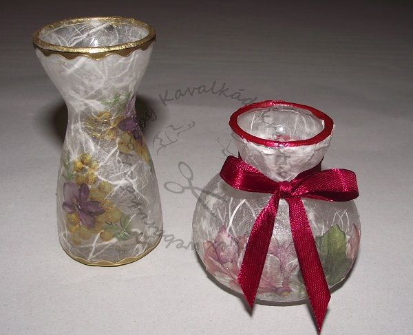 Tipp: korábban gyakran előfordult, hogy a nagy virágcsodálásban egy-egy virág feje letört, vagy kicsit rövid szárral sikerült leszedni a mami virágait, ilyenkor mini váza híján egy üvegpohárba tettük a szerencsétlenül járt növényeket. A pohár gyakran felborult, vagy teljesen elfeküdt a virág a pohárban. Ez a kis váza kiválóan alkalmas, hogy ezek a balesetet szenvedett szépségek méltóbb helyen virulhassanak tovább. Kiváló anyáknapi ajándék. A képen rizspapírral, és szatén szalaggal díszítettem anyukám születésnapjára.