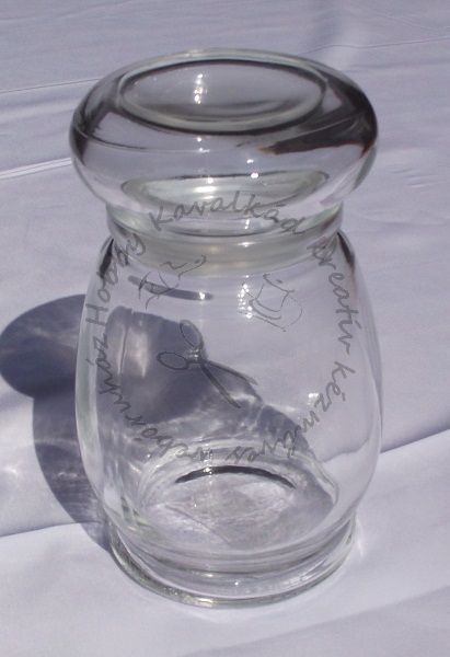 Az üveg talpának átmérője: 7 cm. Hasának átmérője: 8 cm. Magassága 13,5 cm. Űrtartalma: 30 cl. Tetejében aromazárós műanyag rész.