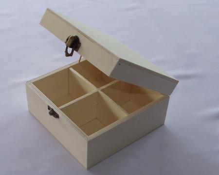 15 x 15 x 8 cm. Belsejéből a 4 részre osztó lapok kiszedhetők. Anyaga rétegelt lemez.
