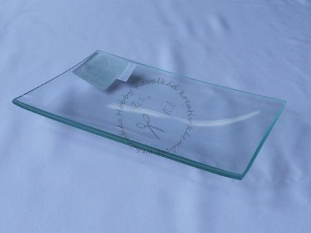 Sarkainál felhajló téglalap alakú üveg tál. Méretei: 10,5 x 15,5 cm.Kifutó termék, további beszerzésre nincs lehetőség!