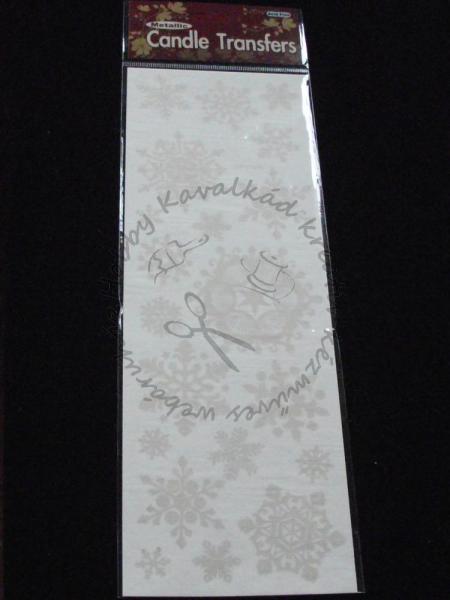 30,5 x 10,5 cm-es lapon több arany glitteres matrica, melyet 15-20 másodperces áztatás után a transzferpapír segítségével könnyedén felvihetjük a gyertyánkra.