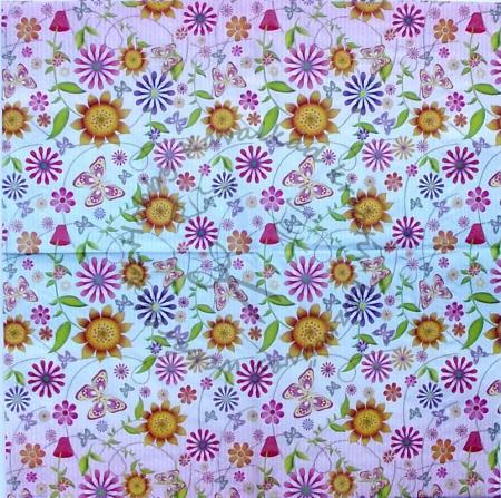 Szalvéta virágos-pillangós kacskaringók , kék-rózsaszín csíkos