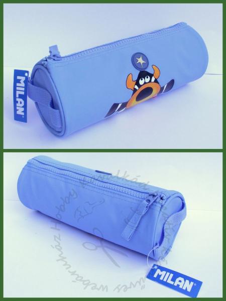 Méretei: 21 cm hosszú, átmérője: 8 cmAnyaga: erős poliészter.Zippzárral zárható. Egyik végén praktikus fogóval.Színei: szép égszínkék, tarka boci mintával.Az asztalon rendkívül kis helyen elfér, viszont nagy mennyiségű írószer elfér benne.