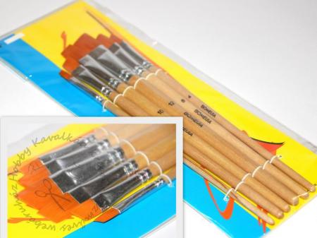 6-15 mm szélességű ecsetek szintetikus szőrrel. Alkalmas víz- és olajbázisú festékekhez.Nyél: lakkozott faTisztítása szappanos vízzel.